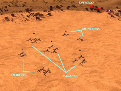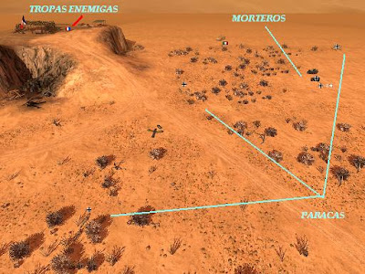 | Pues aquí te muestro algunas capturas que he realizado de la partida. Ya está algo avanzada pero te resumo que tras tomar la Estación dividí las tropas y me dirigí al paso de la montaña lanzando antes a los paracas para averiguar que tropas enemigas había situadas. Con bastante paciencia y esfuerzo pude hacerme con el paso y sin atacar el aeródromo, aunque eso sí, tuve que repeler el ataque de unas tropas situadas cerca. Ya te he comenté que desconociendo la dinámica del escenario decidí apoyar el ataque al poblado desde la carretera situada en la montaña. Envié a los paracas a inspeccionar el área y siempre con la opción de ataque por su cuenta desactivada. Added (2010-09-27, 2:08 Am) --------------------------------------------- Para acceder a la montaña pude hacerme con un cañon con bastante línea de tiro pero al tener que ahorrar munición me dí cuenta que los morteros no la consumen. De tanto usarlos ya se encuentran más posiblilidades y usando a los paracas como visión y una moto como huída ideé una estrategia que creo bastante buena y sencilla: disparar y correr como Angel Nieto. Con ella comencé a limpiar la carretera de enemigos. Conviene poner la moto mirando en la dirección de huída y lo más cercana a la unidad de morteros, sobre todo si el enemigo dispone de vehiculos ligeros. Added (2010-09-27, 2:12 Am) --------------------------------------------- Ya con la carretera libre los morteros llegaron al area indicada. En esta imagen eliminan un cañon enemigo. Added (2010-09-27, 2:15 Am) --------------------------------------------- Eliminé todos los edificios al alcance para evitar que el enemigo los tomara y no permitir una cómoda línea de visión en ese area. Added (2010-09-27, 2:18 Am) --------------------------------------------- Con esta táctica de ataque y huída pude desacerme también de un grupo importante de tropas cercanas al paso de la montaña. Eso sí, con paciencia. Bueno, pues hasta aquí. Ahora me dispongo a tomar el poblado con el apoyo de tropas italianas llegadas a la estación y tal vez encuentre munición para seguir con la primera idea de apoyo artillero desde lo alto. Lo mismo con el aeródromo. Ya te contaré. Por otra parte comentarte que tengo problemas a la hora de realizar capturas de pantalla ya que despúés del realizarlas, minimizar el juego y pasarlas al Paint, los mandos de las unidades no van bien y tengo que reinicar el juego para ponerlo todo en orden. También he intentado grabar un video pero el programa que utilizo habituallmente no me va. Espero solucionar estos problemas. Y otra cosa, no se si por medio de las reglas del editor se podrían poner los mensajes de tu mapa en castellano o necesariamente hay que hacer uno en inglés y otro en castellano. Por ejemplo, se me ocurre crear una variable que el jugador activaría al seleccionar una de entre varias banderas situadas en el mapa, y así los mensajes saldrían en el idioma elegido. Podría abrir el escenario con el editor y traducir los mensajes pero no quiero contemplar el mapa hasta que no haya acabado la partida. También me surje la pregunta de si se pueden incluir videos en los escenarios, como los de introducción a la campaña pero incluso realizados por nosotros mismos. Algo de historia, por ejemplo.